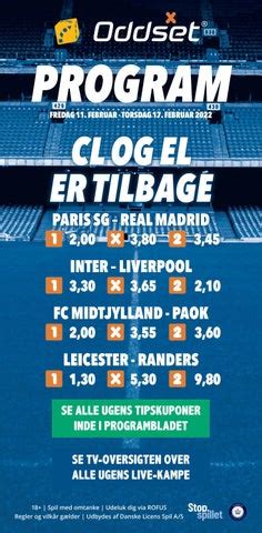 Se programbladet for Oddset her og se de næste 48 timer eller 7 dage. Du kan også printe programbladet hvis du gerne vil have det fysisk. Spil hos os skal være sjovt og må ikke tage overhånd. Her kan du blive klogere på, hvordan du holder dit spil under kontrol, hvilke risikotegn du skal være ... Danske Spil er ejet af dig og mig. Vi tilbyder spil som glæder, underholder og overrasker. Vi tager ansvar for at spil bliver ved med at være underholdning. Dantoto Oddset Danske Spil A/S Prøv vores nye app. INSTALLER · 18 +. |. Spil med omtanke ... Danske Spil koncernen. Udeluk dig via ROFUS. Danske Spil koncernen kontroleres ... Til at vise dig markedsføring af Danske Spils produkter på andre hjemmesider. Se programbladet for Oddset her og se de næste 48 timer … Kampe. Spilstop Nr. Kampe. Fodbold - Odds, Live Betting & Streaming Danske Spil - Hele Danmarks spilleselskab