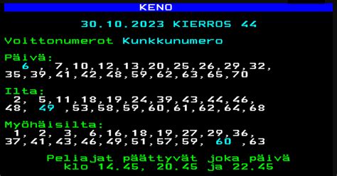 Aluksi kenoarvonta oli katsottavissa televisiosta suorassa lähetyksessä, ja numerot arvottiin satunnaislukugeneraattorin avulla. Asiaan tuli kuitenkin muutos; nykyään arvonta suoritetaan suljettujen ovien takana, ja toimenpiteeseen käytetään loton tapaan erityistä viranomaisen hyväksymää ja valvomaa arvontakonetta. Kenonumerot arvotaan arvontalaitt... 25 Sept 2026 — Uusi Kenotulokset työkalumme näyttää sinulle aina uusimman tuloksen , oli kyseessä sitten Päivä, Ilta tai Myöhäisillan arvonta. Katso ajantasaiset Keno tulokset ja voittoluokat helposti . Päivittäiset päivitykset ja tarkat tulokset jokaisesta arvonnasta. parhaat tulokset ja voitot päivittäin Veikkaus kenon parissa! Tervetuloa Kenon-tulokset.com -sivustolle, josta löydät uudet Veikkauksen Kenon tulokset ja oikeat numerot tänään , eilen ja toissapäivänä, sekä myös kunkku- ... Kenossa pyritään arvaamaan oikein arvotut numerot . Pelissä käytetään yleisesti 40-80 numeroa, ja pelaaja valitsee 2-10 numeroa pelipöydältä. Tämän jälkeen ... Tarkista viralliset keno numerot täältä ✓ Kenonumerot arvotaan kolme kertaa vuorokaudessa. Miten kenoa pelataan? Lue lisää kenosta täältä! Keno ilta -arvonta: Ilta -arvonta suoritetaan kello 20.45 jälkeen ja sen ... Kokeile vaikka 1-15 numeron Kenoa , jossa numerot valitaan 80 numeron joukosta. Tutkimusten mukaan Kenossa kaikkein useimmin arvotut numerot ovat: 1, 2, 4, 6, 8, 16, 18, 31, 38 ja 43. Toisaalta ero muiden numeroiden esiintymiseen on niin ...
