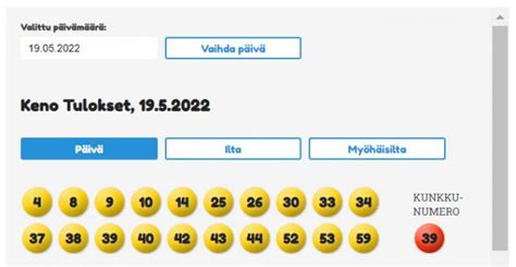 Sivu 474 - Teksti-TV Tämä Keno on nimeltään Numerokeno, jossa valitaan 2-10 numeroa ja arvonnassa arvotaan vain 40 numeroa. Keno on peräisin Kiinasta tuhansien vuosien takaa, … Keno Tulokset & Voittonumerot Keno Tulokset - Tarkista Tuoreimmat Kenotulokset Täältä Helposti Veikkaus.fi-verkkokaupassa Lotto, Keno , Pitkäveto, nettiarvat ja kolikkopelit. 9 Nov 2026 — Katso viralliset arvontatulokset Keno tulokset -otsikon alta! keno pelin tulokset voit tarkistaa tältä sivulta . Miten Keno tarkistetaan? Kenon ilta-arvonta televisiossa - Tulokset | Kenonumerot Tarkista viralliset Keno-tulokset . Katso oletko juuri sinä uusi Keno-voittaja! Löydä oikeat kenonumerot kaikista arvonnoista. 2 days ago · Katso arvonta-aikojen lista ja selvitä tarkka aika seuraavalle arvonnalle. Tulokset julkaistaan verkkosivullamme heti arvonnan jälkeen. Ennen pelaamista kannattaa vilkaista keno … Keno tulokset - Salibandy Keno on yksi Veikkauksen suosituimmista peleistä. Keno-arvonta kolme kertaa päivässä. Voit tarkistaa Kenon numerot ja tulokset täältä . Tulosarkistosta voit hakea vanhojenkin pelien tulokset helposti ja nopeasti . Valitse vain peli ja haluamasi aikaväli. Katso tulokset! Keno tulokset: tarkista uusimmat numerot & arvontojen aikataulut. Seuraa päivityksiä päivittäin, vertaa rivejäsi & näe voittoluokat sekä palkinnot.