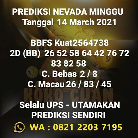 Prediksi Nevada Jumat 13 Maret 2026 ... Data Sydney 6D memberikan prediksi Nevada yang akurat dan terpercaya. Dengan analisis mendalam, prediksi ini sangat ...