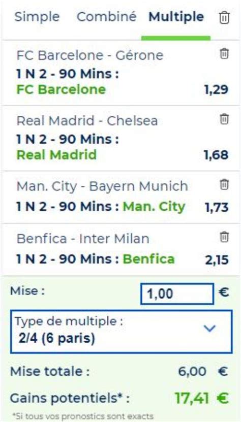 Le simulateur / calculateur suivant permet de tester ses paris combinés. Il suffit de saisir le nombre de paris sportifs à combiner ensemble et la mise totale, ainsi que les cotes de chacun . Le simulateur calcule automatiquement le gain potentiel, la cote globale associée et la probabilité de victoire afin de se rendre compte du risque pris. Pari combiné, simulateur de gains et probabilité Calculateur gain paris sportif Simulateur en ligne GRATUIT Appli Simulation Pari Sportif - Parions Sport En Ligne , pariez et regardez vos matchs en direct. Profitez de nos meilleures cotes sur de nombreux sports : Foot, Basket, Tennis et profitez ... Pari système : Maitrisez comme un pro Tout Comprendre sur les Paris Multiples - Sites de Paris Sportifs Un pari combiné consiste à regrouper plusieurs paris sportifs en un seul, avec une seule mise. C'est un pari plus risqué car pour gagner il faut que tous les pronostics soient exacts , mais qui peut peut rapporter gros car la cote de ce pari combiné est obtenue en multipliant entre elles toutes les cotes des paris regroupés. 3 formules de paris : simple, combiné, multiple - Parions Sport 27 Nov 2026 — Lorsque vous pariez sur un système, vous créez plusieurs combinaisons de paris , qui sont ensuite regroupés pour former un seul pari. Ce type de ...