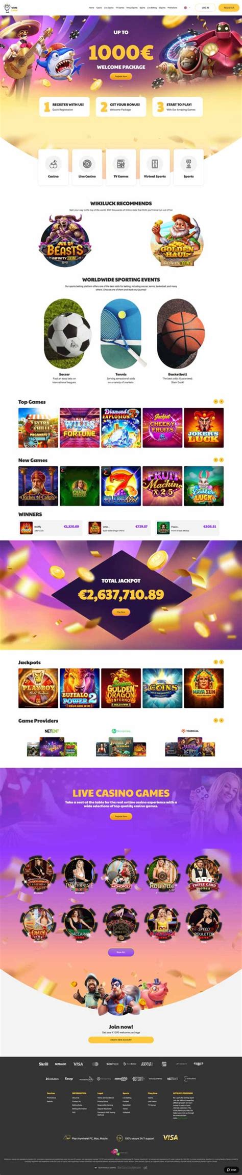 Wikiluck Casino Review Sustainability in Every Shade of Green. WikiLuck Casino Review Wikiluck Casino arvostelu, Bonus, luokitus Suomessa 2026 Wikiluck Casino — Login, Welcome Package Up To 1000€ Kaikki tärkeät tiedot Wikiluck Casinosta, kolikkopeleistä, bonuksista, rajoista, maksuista ja muusta osoitteessa pomus.net. Pros · Multiple payment methods including crypto · High monthly withdrawal limits (AED 73,000+) · No wagering on some tournament prizes · 24/7 customer support ... Aug 2, 2026 · Wikiluck Casino successfully delivers in the gaming department, as players can browse through over 130 software developers on its website. This relatively large number of providers … Experience the ultimate thrill at Wikiluck Casino, where Australian players find their gaming paradise. With an eclectic mix of pokies and table games, you'll be spoilt for choice. Payment methods popular … Wikiluck Casino on vuoden 2026 tuore kasinouutuus Wikiluck review all about the advantages of this online ... WikiLuck Casino offers a generous bonus package for new players, spreading a Welcome Offer of up to €1000 across your first four deposits of at least €20 each. The casino offers a wide range of live betting options across various football leagues , providing numerous betting choices for each game.